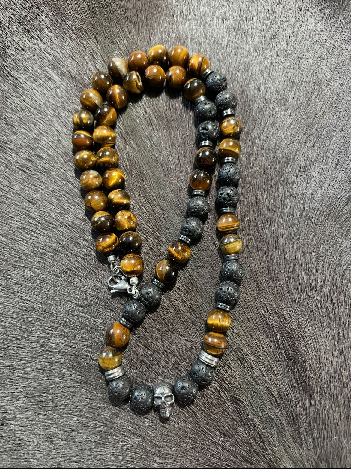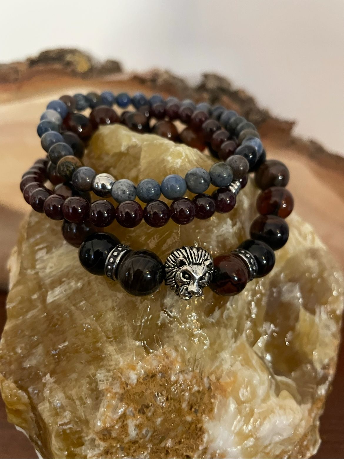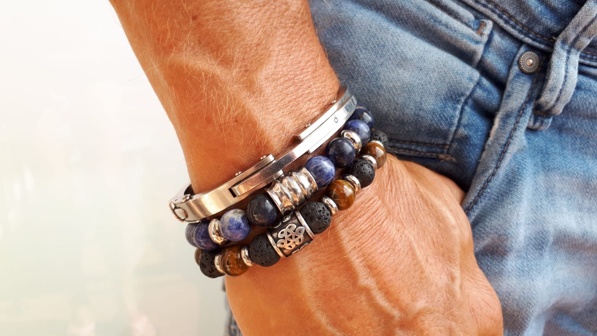 Sodaliet (blauw-wit) gecombi-neerd met rvs kralen en Tijgeroog gecombineerd met Lava kralen en rvs kralen