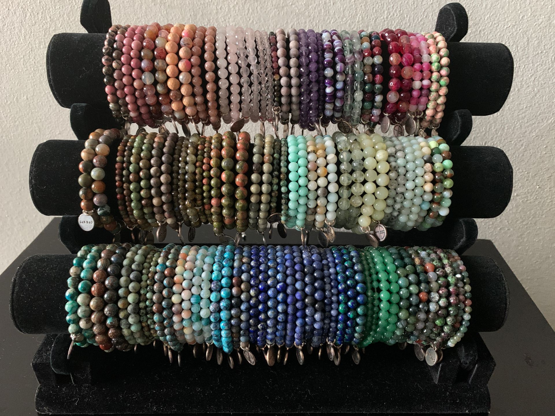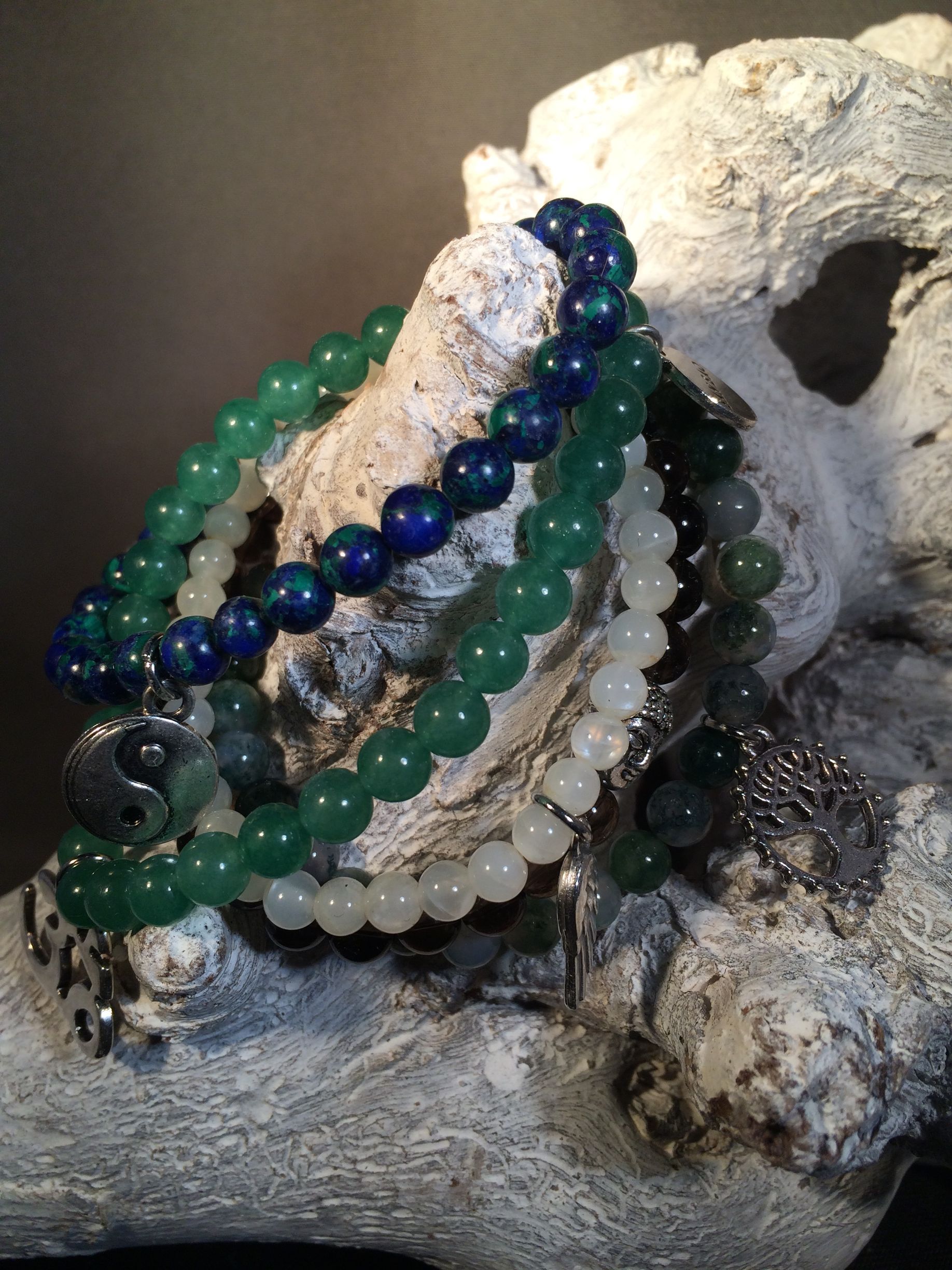 Armbandjes met bedels van Azuriet-Malachiet, Aventurijn, Regenboogmaansteen, Rookkwarts en Mosagaat