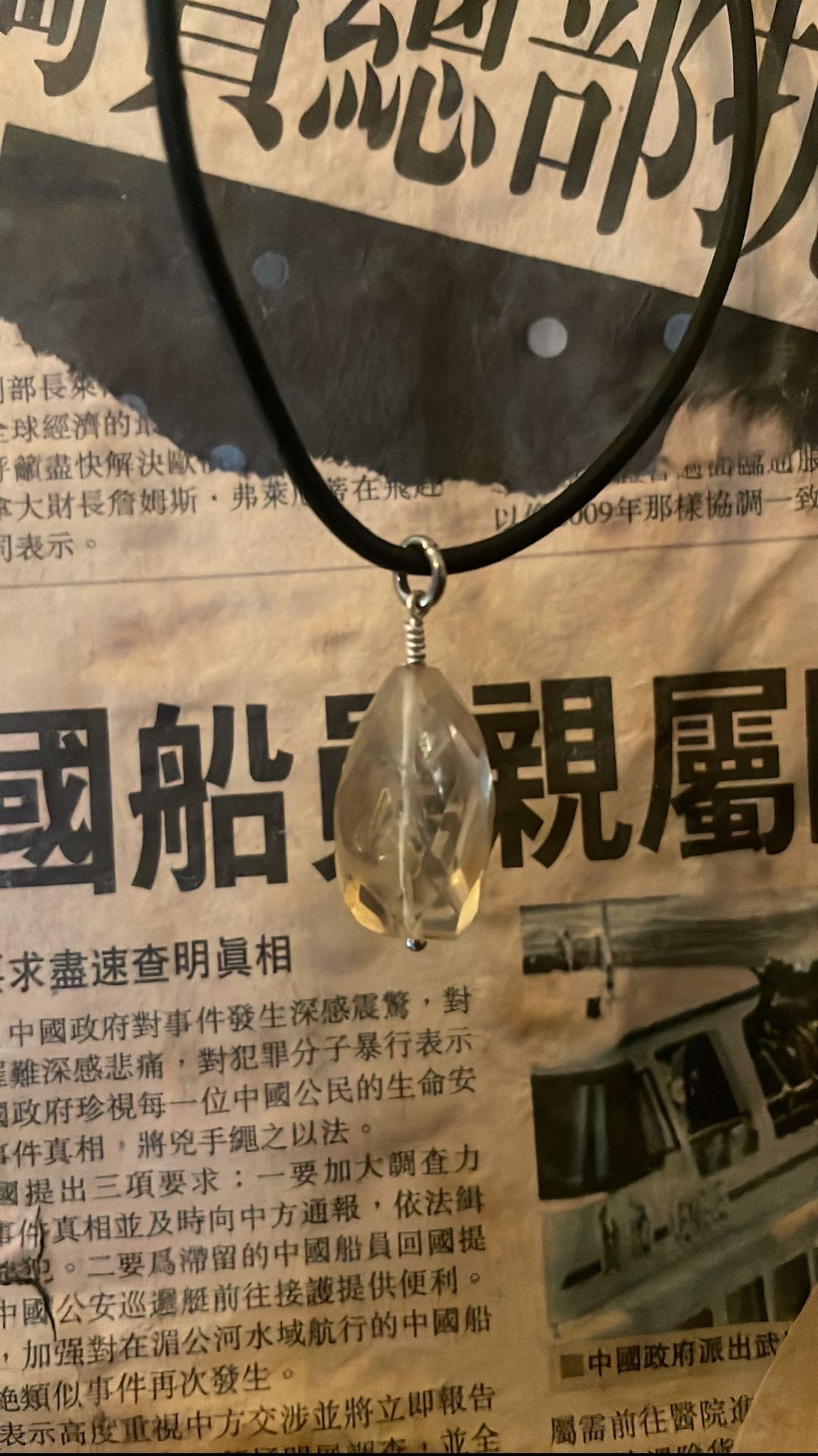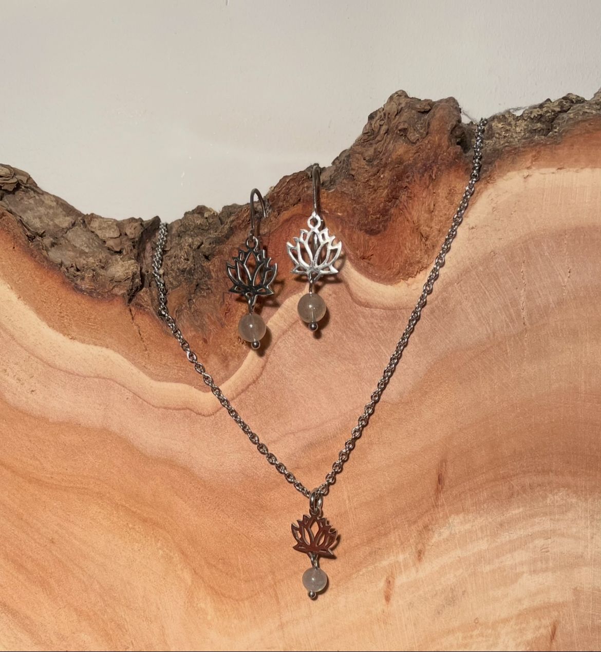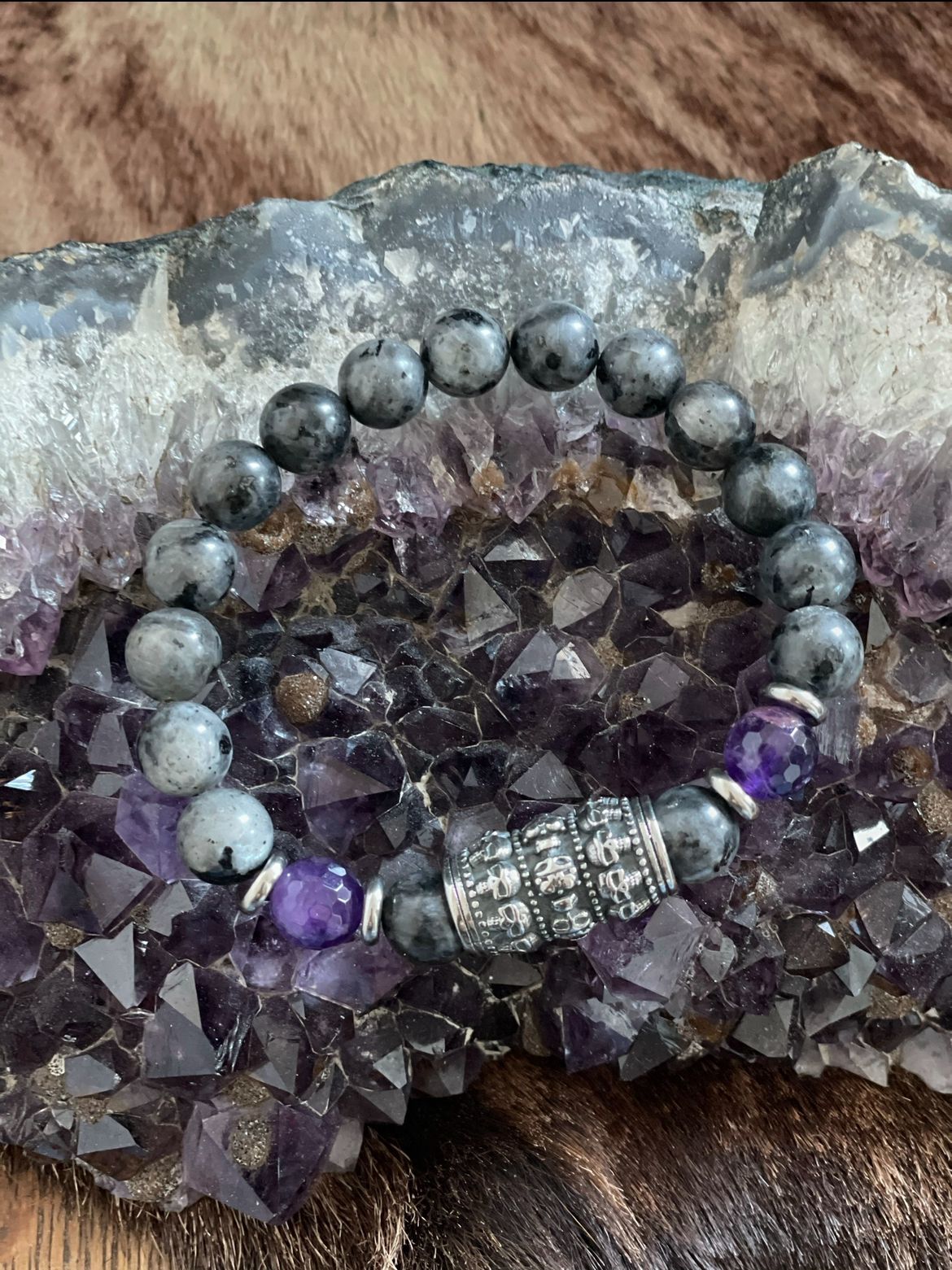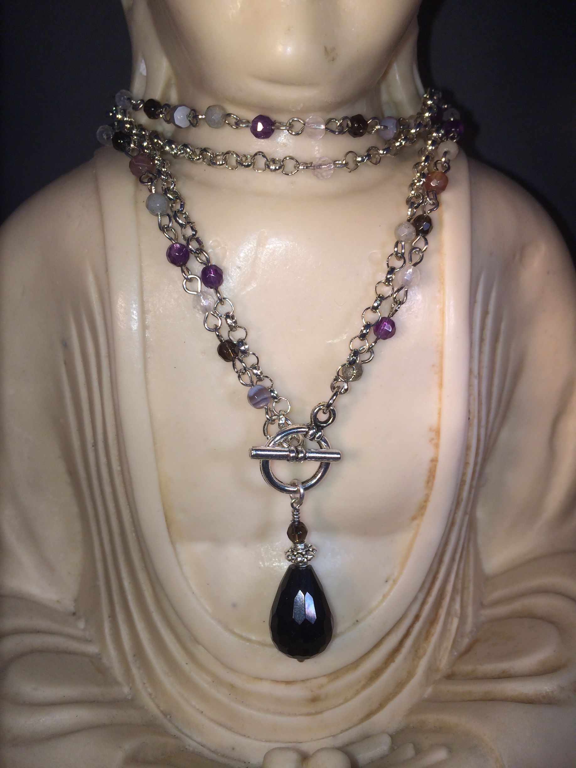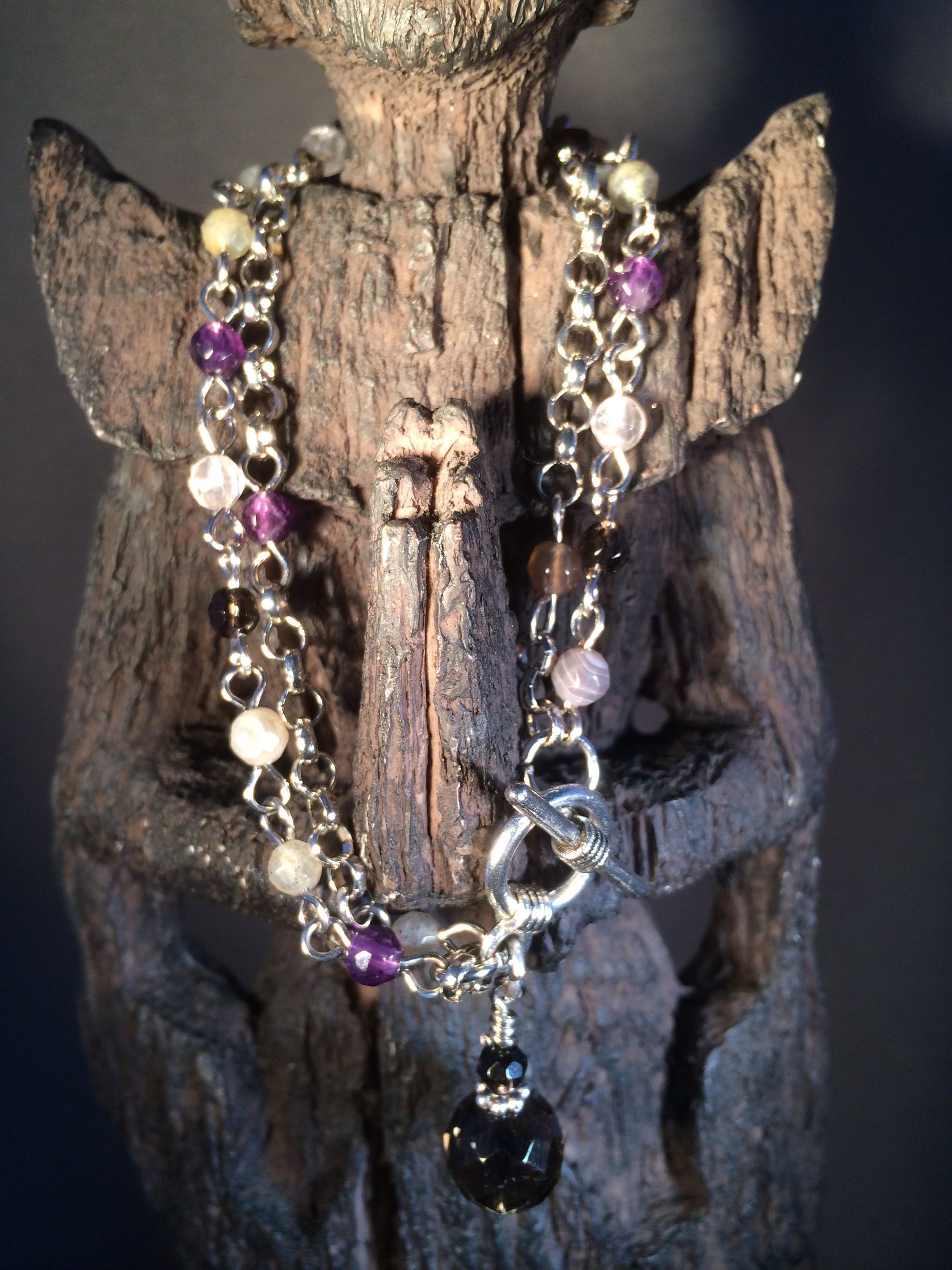 Labradoriet (lichtgrijs), Amethist, Rookkwarts, Rozenkwarts en Botswana agaat. Druppel van Rookwarts